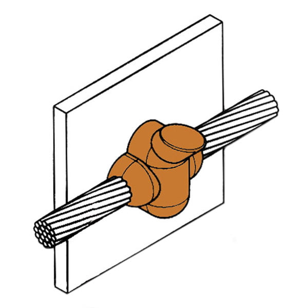 Horizontal thru Cable to Vertical Steel Surface Joint is a cable to surface exothermic welded connection that requires an HCD Handle Clamp.